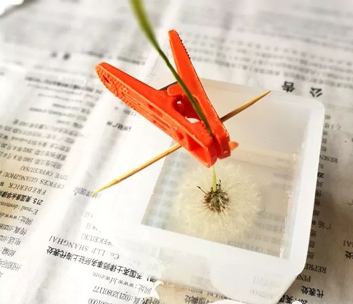 步骤一、先把蒲公英头固定好在模具,怎么固定呢?这里我用夹子夹住蒲公英的枝条,让蒲公英头朝下(夹的时候要注意蒲公英头要调整好位置,不然放太歪或太下面了就不好看了),然后拿出牙签,利用牙签撑住夹子,让蒲公英悬浮着,不让它掉进模具里,