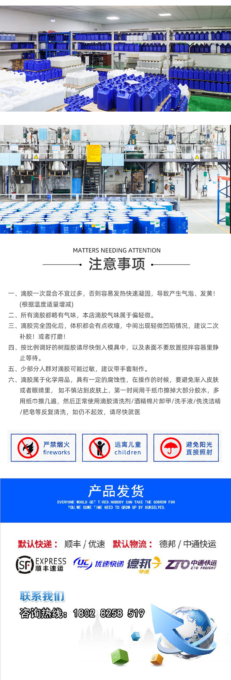 2.根据可操作时间及用量调配胶量,避免浪费.当气温低于15℃时,请先将A胶预热至30℃后再进行调胶,易于操作(气温低时A胶会变稠);使用后必需密封桶盖,避免因吸潮而造成产品报废.