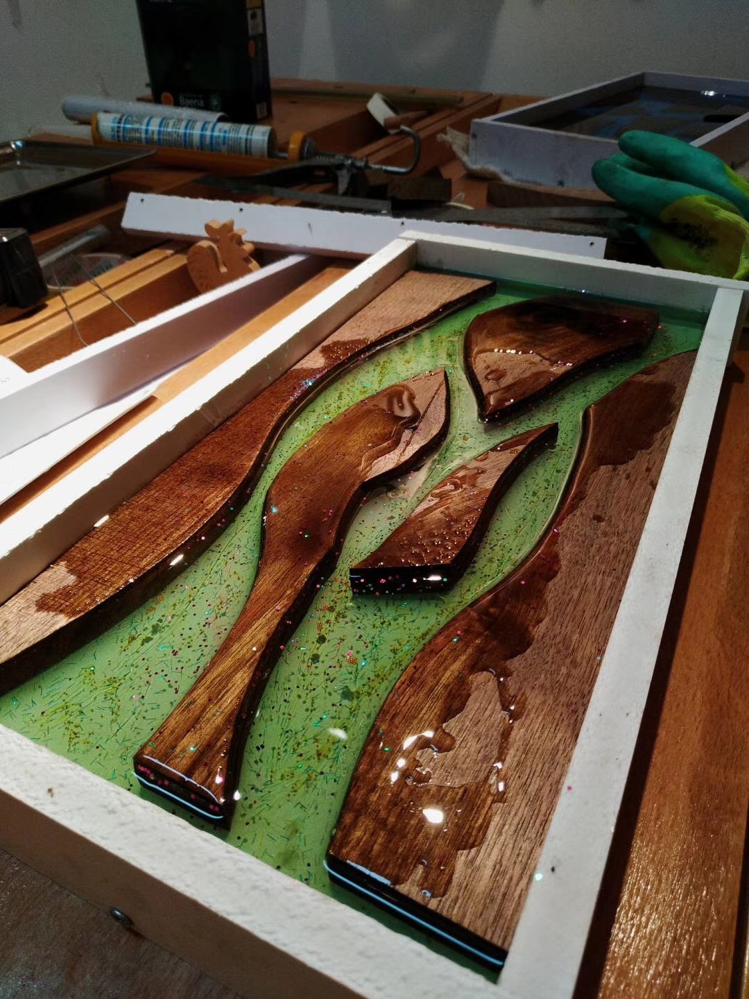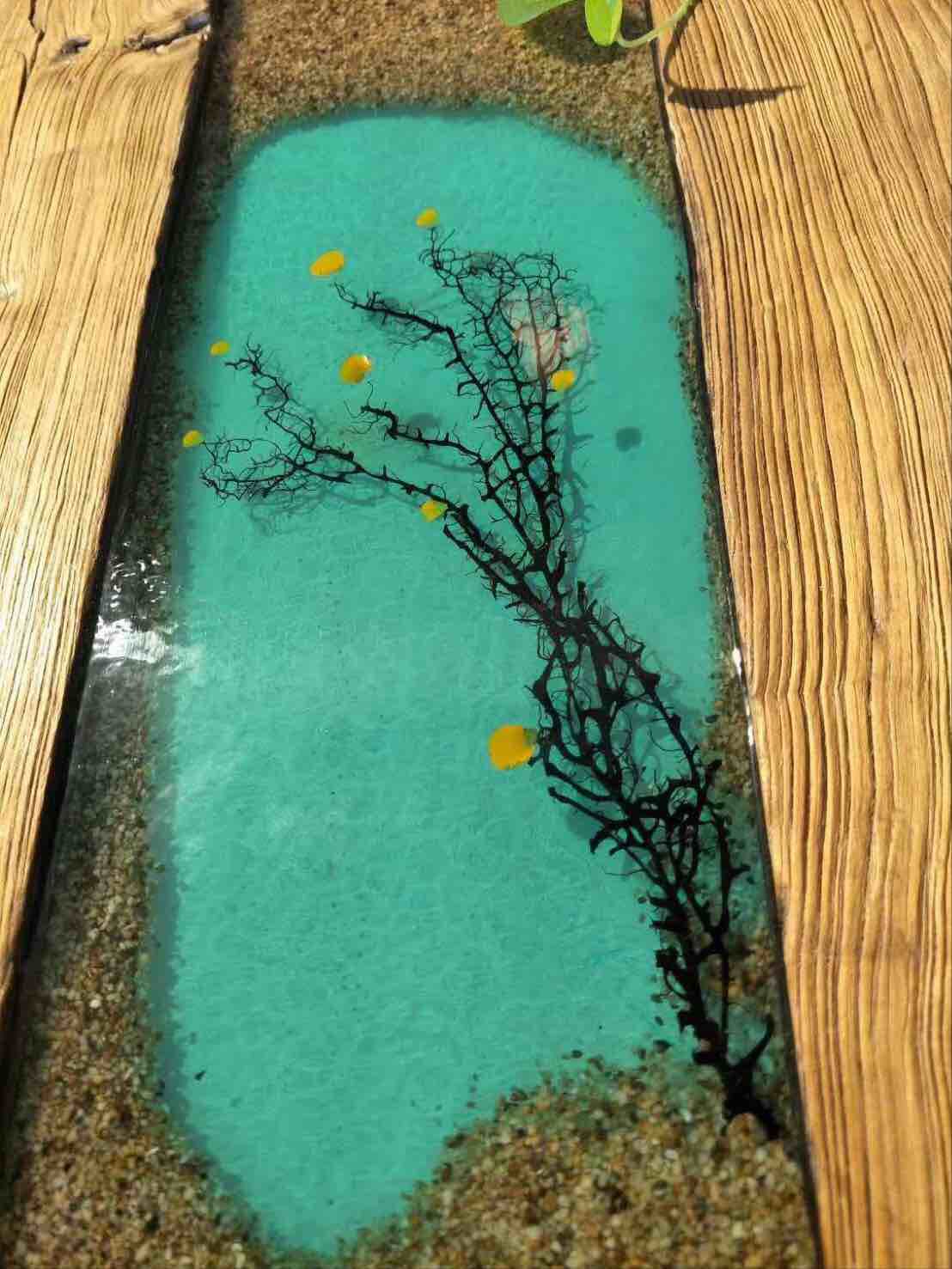 若胶水中混合的是色粉,爆聚现象一般不会很明显,不影响河流桌的正常使用。但如果胶水中使用的是色精,那么如果发生了爆聚现象,那么只能把胶敲掉了。因此制作河流桌过程中务必控制好室温。